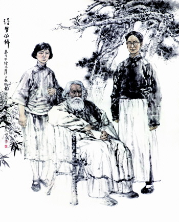 《诗梦依稀》是王磐德具有浓烈文人情结的作品。在绘画创作中,鲜有把这三位文化名人创作在一起的场景,而多年以前王磐德搜集有关泰戈尔、徐志摩、林徽因的存世照片及故事。画面中泰戈尔鬓发皆白,长髯飘拂,恰似一棵不老松。林徽因举止文雅,站在泰戈尔身后,红颜白发相映成趣,再加上面容清癯、身材颀长的徐志摩,用意向性的“松竹梅”巧妙的表现了他们三者之间的关系,生动传神。