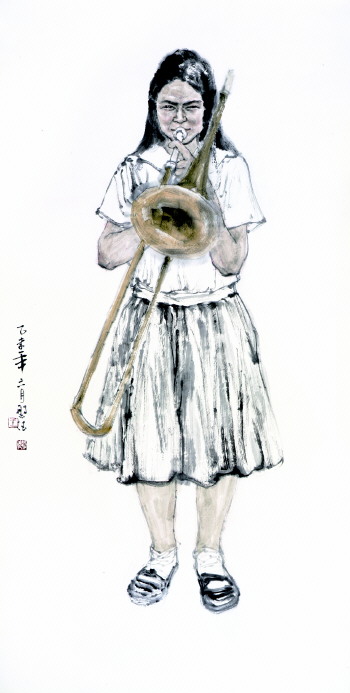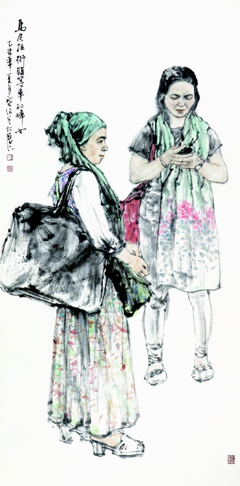 在他的作品中,不仅能够看到人物形象的典型动态,还能够感受到传统笔墨的博大精深。在传统文化和现代艺术观念碰撞下,对水墨语言的探索以及对不同人物形象的尝试贯穿着王磐德的艺术之路。他对现实人生的描绘,以及对社会正能量事物的弘扬,展示了他作为一位文人画家的社会担当。而作为文人,他对文化又有一种无以复加的敬重。