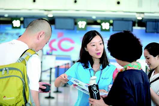 新员工在社会实践中向旅客推介山航APP客户端“掌尚飞”。(资料片)