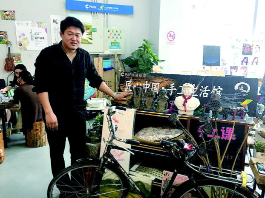 高琪把一辆老式自行车摆在手工生活馆的门口,用来展现自己的情怀。 王颖颖 摄