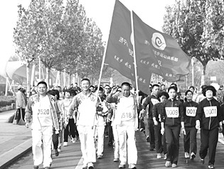 17日,由济宁广播电视台都市频道举办的“2015中国农业银行杯”全民健身徒步行活动在太白湖举行。来自全市各行各业的1500多人,从北湖阁出发,徒步8公里后走向终点。 本报记者 李岩松 摄