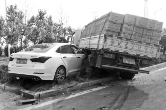 本报10月18日讯(记者 王震) 18日上午,在文登区畅海路,一对路况不熟悉的轿车司机,遇上了修路改线,与一辆小货车相撞,一头扎进货车底部,差点拱翻货车,货车内一乘客受伤。