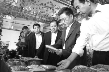 副市长郭建民(右二)在县(市、区)农业特装展区了解果蔬种植情况。本报记者 张超 摄