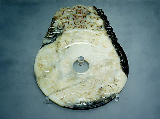 玉璧是一种中央有穿孔的玉器,为我国传统的玉礼器之一,也是“六瑞”之一。这件东汉宜子孙玉璧是一种“出廓璧”,也就是玉璧的外缘轮廓处附设有镂空纹饰。镂空纹饰的内容主要有龙纹、螭纹以及“长乐”、“万寿”、“长宜子孙”等吉祥文字。