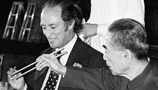 1973年,周总理教老特鲁多使用筷子。(资料片)