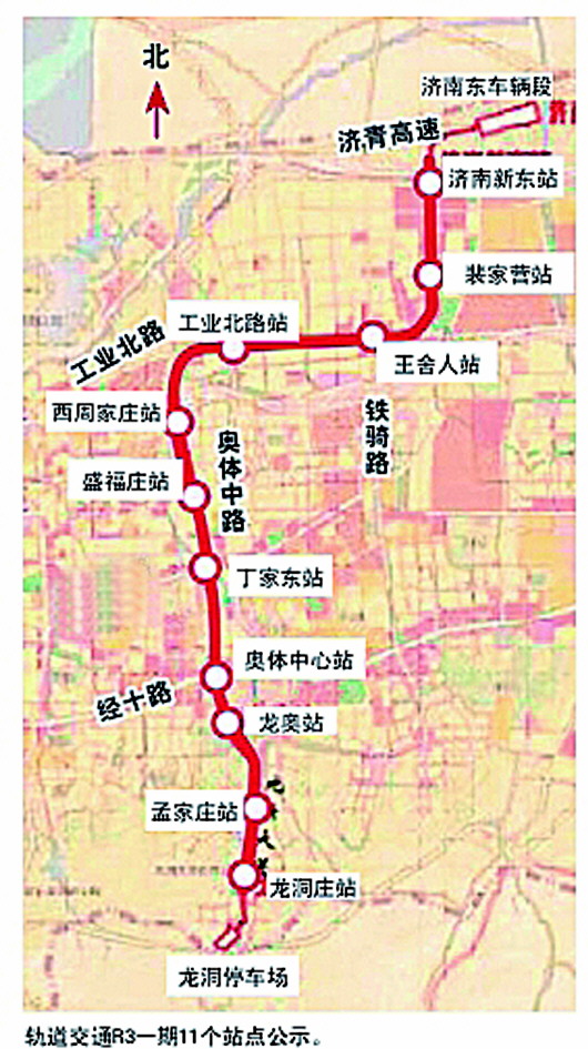 记者了解到,目前,R3线一期工程11个站点的工可报告已编制完成,正开展初步设计工作。根据此前招标公告的公示,R3线一期工程起于龙洞庄站,沿龙鼎大道—奥体西路—工业北路—济南新东站中轴规划道路走行,止于济南新东站,设站11座,全线均为地下敷设。11个站点由南向北依次是龙洞庄站、孟家庄站、龙奥站、奥体中心西站、丁家东站、盛福庄站、西周家庄站、工业北路站、王舍人站、裴家营站和济南新东站站。
