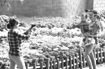 家长带着双胞胎孩子在花展造型前合影留念。本报记者 张晓科 摄