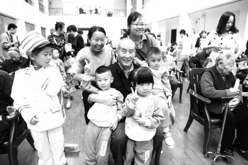 20日,山推幼儿园的小朋友来到洸河街道黄庄老年公寓,陪在爷爷、奶奶们过重阳节。在活动现场,孩子们把自己带来的食物送给爷爷、奶奶们,并温馨地偎依在老人的身旁,和爷爷、奶奶们合影留念。 本报记者 黄广华 摄