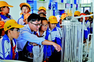 ◤工作人员为学生讲解核能发电的原理。