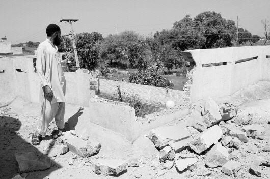 2015年8月,在印巴边境,一名巴基斯坦居民站在被流弹击毁的房屋外墙边。 新华/法新