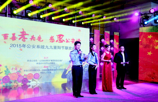 10月17日,在2015年九九重阳节来临之际,由单县公安局和山东能源肥矿集团陈蛮庄煤矿、单县农村信用合作联社共同主办的“百善孝为先、感恩公安情”九九重阳节联欢会在单县李田楼陈蛮庄煤矿举行。旨在大力弘扬尊老敬老的中华民族光荣传统,充分表达全体在职在岗民警对离退休老干部、老同志的尊敬感恩之情。