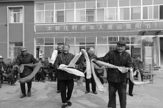 为庆祝重阳节的到来,丰富老年人的文化生活,近日,孟庄镇大郭庄村为全村51名80岁以上的老年人每人量身订做了一套长寿棉衣,为每位老年人送上了两袋精粉面。在庆祝现场,老年人还参加了跳秧歌、吹气球比赛,赢得现场阵阵掌声。  本报通讯员 刘勇 李锋 本报记者 孙越 摄影报道