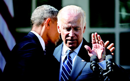 21日,在华盛顿,美国副总统拜登(右)在新闻发布会后与总统奥巴马拥抱。 新华/路透