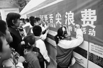 18日,在潍坊市开元街道孙家杨孟小学,学生在“拒绝舌尖浪费”的横幅上签下自己的名字。为培养学生爱惜、节约粮食的意识,开元街道孙家杨孟小学开展了相关的主题教育活动。