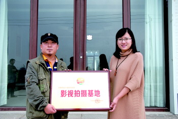 秦一书导演(左)授予荷仙子湿地风景区影视基地牌匾。