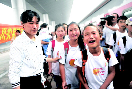 2009年6月18日,在日照火车站,500多名汶川地震孤儿与100多位“安康妈妈”依依惜别。