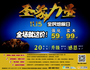 2015年注定是一个不平凡的一年,这一年齐鲁晚报迎来了她1万期的特刊,而圣象也迎来了20周年庆典,双喜同庆怎么能没有惊喜呢?圣象大型促销活动“11·15全民地板日”已经全面开始!11·15全民地板日是圣象极力打造的行业固定地板节日,是圣象全年力度最大,覆盖范围最广泛的一场全国规模的促销狂欢节日,是圣象集团旗下44家分公司、28个分会场、3000家专卖店,50万消费者的节日!