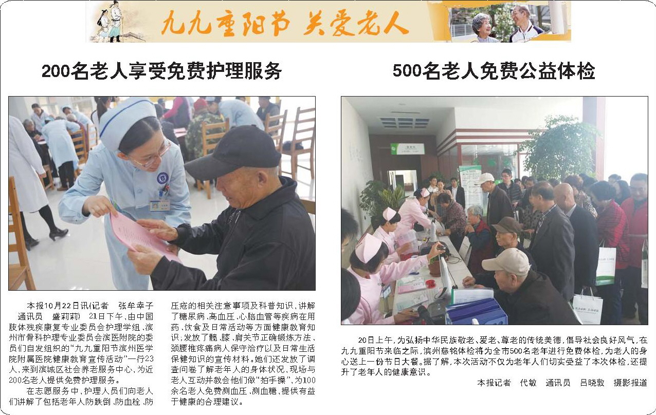 本报10月22日讯(记者 张牟幸子 通讯员 盛莉莉) 21日下午,由中国肢体残疾康复专业委员会护理学组、滨州市骨科护理专业委员会滨医附院的委员们自发组织的“九九重阳节滨州医学院附属医院健康教育宣传活动”一行23人,来到滨城区社会养老服务中心,为近200名老人提供免费护理服务。