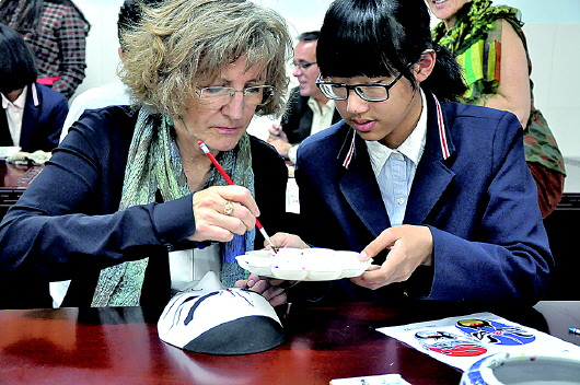 10月21日,济南市东方双语实验学校师生迎来了来自法国的教育界人士一行20多人。学校京剧、民乐的表演,引起外宾极大兴趣。他们走进学校的美术课堂,体验了一把“画脸谱”。校园体育节上,和中国孩子一起拔河、做游戏。