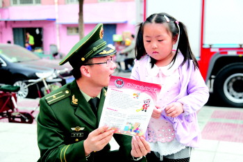 24日,济宁市公安消防支队市中大队来到前铺社区,发放消防安全知识宣传单、组织观看消防知识电影、消防知识有奖竞答,用丰富多彩的宣传形式,提高居民的消防安全意识。图为一名小朋友在看消防安全知识宣传单。 本报记者 苏洪印 摄
