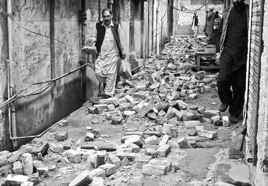 10月26日,在巴基斯坦的斯瓦特,一名当地居民走过震后满地的瓦砾。 新华/路透