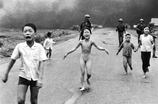 43年前,一张照片记录下9岁的越南女孩潘氏金福遭遇凝固汽油弹袭击后背部被烧、赤身裸体奔逃的情景。