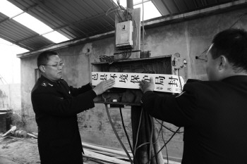 执法人员查封黑作坊。 本报记者 刘振 摄