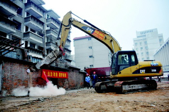 26日9时30分许,已经守候在原淄博先行电子集团宿舍4号楼一旁的破拆车、渣土车正式开始了工作。几分钟后,4号楼前已经破旧不堪的储藏室变为瓦砾。据了解,这是淄博市首个采用政府主导、群众自治模式推动棚户区改造的项目,从入户摸底调查到动迁大会,均由业主们组成的自治改造委员会牵头完成。大图为拆迁现场,小图为建于上世纪70年代的原先行电子集团宿舍楼。 本报记者 王鸿哲 摄影报道