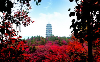 流笺桥和万叶塔是红叶谷景区观赏红叶的最佳地点,在流笺桥可以仰望远处的山峦,蔚蓝的天空,火红的山峦,让过往游客流连忘返。