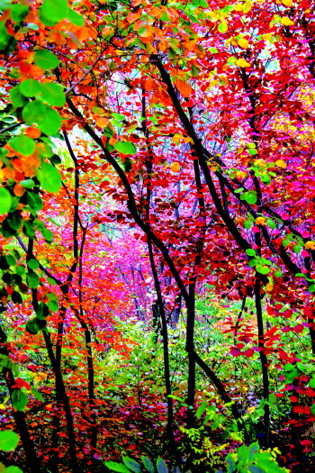 站在万叶塔的顶端,可以鸟瞰整个景区,特别是在早上,烟雾缭绕,朝阳照射在山峰,迷离中透露着一股迷人的魅力。登上万叶塔,满谷的红叶尽收眼底,会惊叹大自然的“似烧非因火,如花不待春”的美丽。
