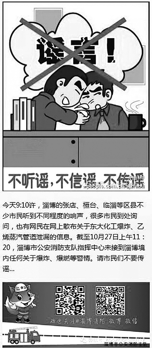 面对甚嚣尘上的谣言,27日11时26分,淄博消防发布官方消息,称“截至10月27日上午11:20,淄博市公安消防支队指挥中心未接到淄博境内任何关于爆炸、爆燃等警情。请市民们不要传谣……”11时35分,淄博警方发布公告,称爆炸信息不实。“今天上午网传我市发生爆炸,经公安机关核实,未接到此类警情。网传图片经核实均为虚假信息。”