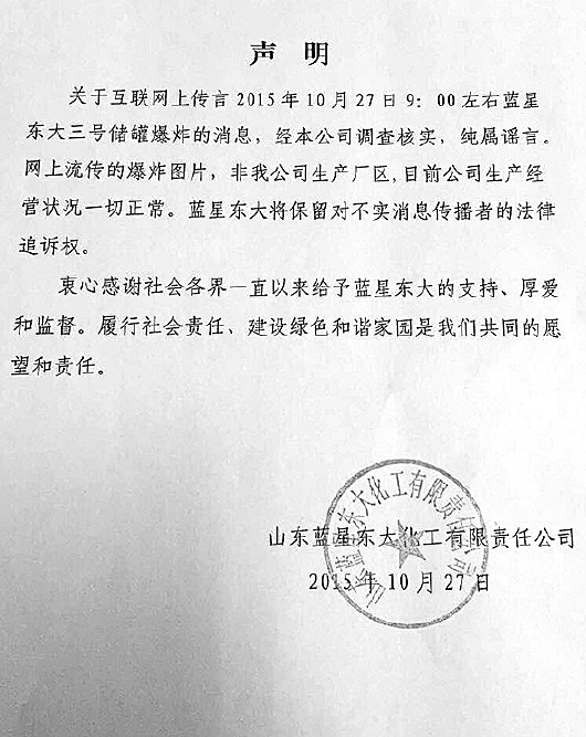 27日,山东蓝星东大化工发表声明,称公司一切正常。