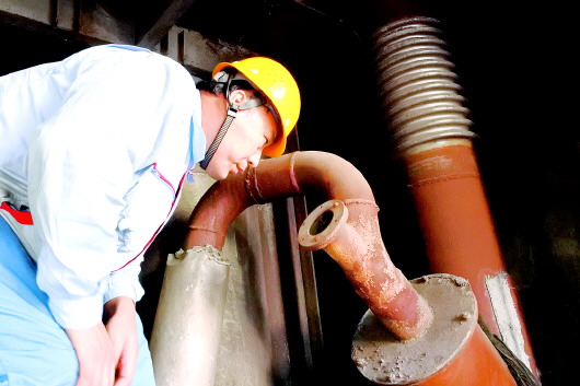 北郊热电厂已经开始点炉,工作人员正在观察锅炉内的运行情况。