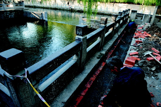 27日,黑虎泉边,工人们在建新的排水沟。由于泉边打水人的撒漏和下雨等原因,泉池边时常积水,这条环绕泉池的隐藏排水沟可以很好地解决这个问题。