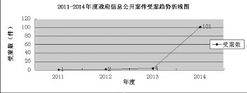 案件数量和比重逐渐上升。自2011年8月13日最高人民法院《关于审理政府信息公开行政案件若干问题的规定》出台以来,受案数量增长较为明显。其中2011年1件,2012年2件,2013年4件,2014年激增至101件,占当年度全部一审行政案件的16.97%(2014年全市法院共受理一审行政案件595件)。政府信息公开案件已然成为行政诉讼新的的热点和增长点。