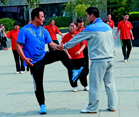 近日,“美丽双泉,共享太极”活动在双泉和生庄园举行。来自省劳动技术学院的太极名师赵为民(前左)携弟子,一起为双泉的太极爱好者授课。目前,双泉镇已经成立了由50人组成的太极队,预计今年底,队伍规模将扩充至100人以上。