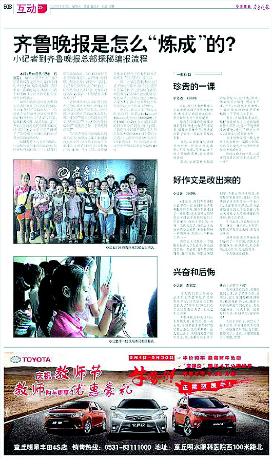 7.凡一次性报名50人以上的学校,齐鲁晚报《今日章丘》将在该校成立小记者站,学校将会有更多报道宣传推介的机会,小记者们将会得到更多采访、参观、拓展、培训等丰富多彩的社会实践活动的机会。