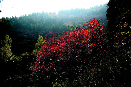 每当到了秋天这个季节,就有一只无形的手把我牵引到离家不远的西山坡上。山上大片的果树,此时很多果子已收获,但经过霜染的叶子却五彩斑斓。远望,像一片褐黄色的海,承接着淡蓝的天空;走近,赤、橙、黄、绿,簇簇“花团”。那“花”开得艳,那“花”开得自然,那“花”开得纯洁,不带一点修饰,便让人眼花缭乱。面对斑斓的色彩无力描绘,瞠目汗颜,只低低吟咏出前人的诗句,“停车坐爱枫林晚,霜叶红于二月花。”坡岗边上,成排的火炬树,火红的叶子像抹了一层油,通红发亮。我坐在一棵柿子树下的山石上,拾起从树上飘落的各色秋叶,在掌中欣赏把玩。有鲜红的,橘红的,暗黄的,金黄的,柠檬黄的,深绿的,浅绿的,黄中透绿的……霜重色愈浓。丹紫色的叶子最惹人眼,这是树尖上的叶子,也最受人收藏。儿时,我就喜欢这红叶,常把它夹在书中珍藏,翻腾旧书时总会发现几片枯叶,淡淡的氤氲的香气流溢着雨露的味道,阳光的味道。