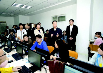 22日下午,在济宁高新区,张高丽考察了惠普软件人才实训基地,深入教室察看培训情况,与在读学生亲切交流。在听取惠普软件大中华区战略发展事业部总经理马莉莉汇报有关情况后,张高丽给予充分肯定和鼓励。