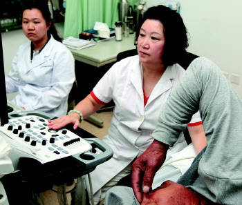 虽然在行业内和病人中间早已名声在外,但大众对于“超声科也可以治病”可能并不十分了解。石磊介绍说,比如现在高发的肛周脓肿,可以在超声引导下进行穿刺用药物冲洗,最后放置一个引流管引出脓液。“这种类型的治疗病人创伤小,痛苦轻,效果好。”
