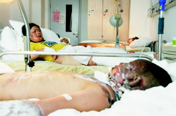 事发当晚,徐兆利一家被送往潍坊市人民医院,一家四口被安排在住院二部17楼的烧伤科病房内。29日上午,记者在病房中看到,受伤最重的徐召利至今几乎无法说话,头部、胸部、手部、脚步和背部都不同程度地烧伤,烧伤面积达到60%。