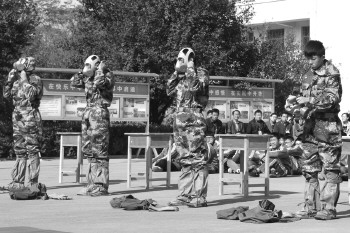 在《中华人民共和国人民防空法》颁布十九周年之际,冠县第三中学内隆重举行了“聊城市人防教育总结表彰暨人防教育示范学校揭牌仪式”,并现场组织冠县第三中学驻训学生疏散逃生、战地止血、防化服穿戴等演练。图为,学生在演练穿防化服。