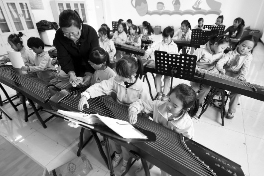 10月28日,河北省大厂县城区二小的孩子们正在练习古筝。对孩子的教育要求高、投入大,是“80后”家长谨慎考虑生二孩的重要因素。 新华社发