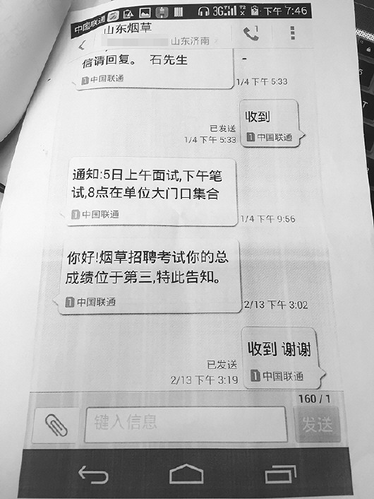 打印出来的手机短信消息中,小银被告知成绩位列第三。