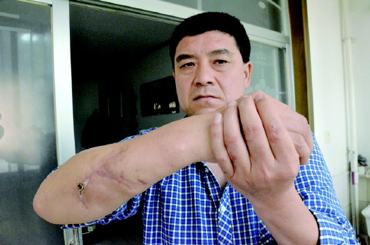 26日,46岁的寻红心在家人的陪伴下,来到金乡县人民医院做检查。“右手前臂恢复较好,但应加强康复训练才能恢复正常功能。”金乡县人民医院骨一科主治医师申宁说。在寻红心的右手前臂,有一条近20厘米长的伤疤,肌肉已经有些变形。