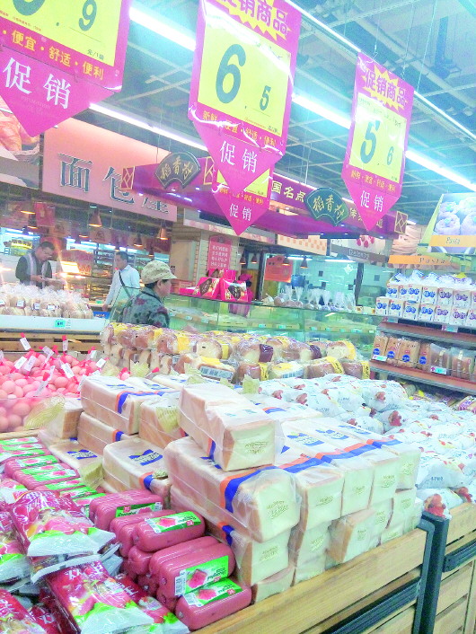 在济南历下区某超市,面粉和面包的价格并没有随着小麦价格的下跌而降低。  本报记者 孟敏 摄
