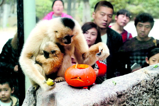 1日,济南动物园,饲养员为长颈鹿、长臂猿等动物特制了万圣节南瓜灯大餐,让动物和游客们一起在万圣节狂欢一把。