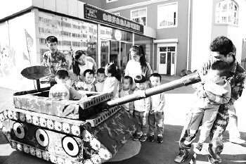 10月28日,山推幼儿园齐鑫园内,小朋友们在老师的带领下认知各种“军事武器”。智慧的老师们精心制作了海、陆、空三军的军事武器模型,供幼儿欣赏认知。山推幼儿园用这种独特的方式对孩子们开展“爱我中华·引以为豪”的爱国主义启蒙教育。 本报记者 黄广华 摄