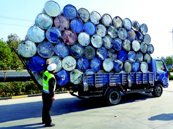 10月30日,平原交警大队民警在幸福大道查获一辆满载122只油桶的超长超高货车。民警协助其联系车辆进行转运,并对驾驶人给予100元的处罚。