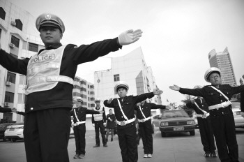 穿上警服指挥交通,学得有模有样